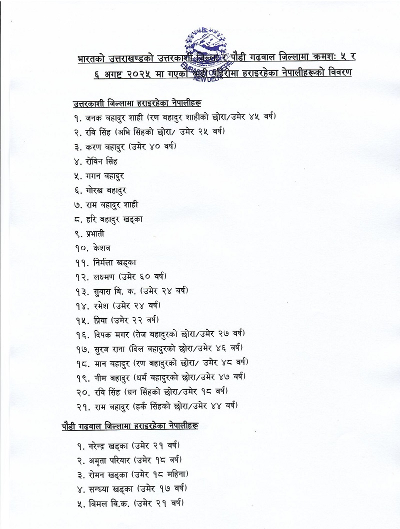 दूतावासका अनुसार पौडीगढवालमा बेपत्ता भएकाहरूमा नरेन्द्र खड्का, सन्ध्या खड्का, रोमन खड्का, अमृता परियार र बिमल विक रहेका छन् ।
