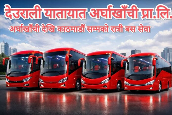 हृदय भुसाल अर्घाखाँची । देउराली यातायात प्रा.लि.ले आफ्नो सेवा विस्तार तथा परिस्कृत गर्ने योजनासहित नयाँ बस सञ्चालनको तयारी थालेको छ। कम्पनीले यात्रुहरूको सुझाव, सल्लाह तथा विश्वासलाई आधार मान्दै सुरक्षित, व्यवस्थित र गुणस्तरीय सेवा प्रदान गर्ने लक्ष्यका साथ अत्याधुनिक सुविधा सम्पन्न बस सञ्चालन गर्न लागेको जनाएको छ।